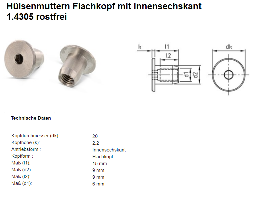 Hülsenmuttern Flachkopf mit Innensechskant, 1.4305 rostfrei M6x15