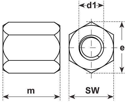 Sechskantverlängerungsmuttern 3d, DIN6334 Stahl blank M16x48