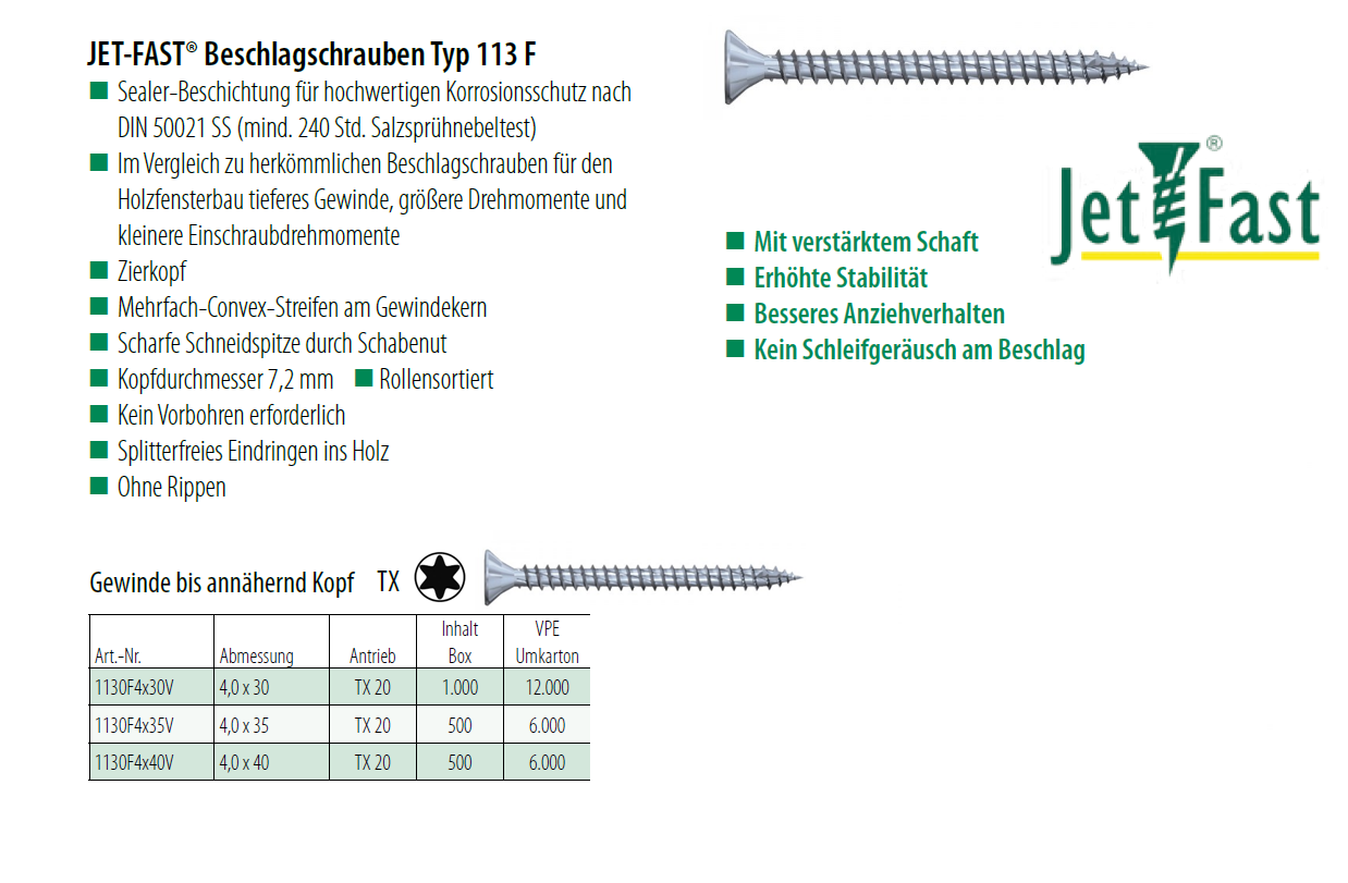 JetFast® Beschlagschrauben Senk-/Zierkopf Torx, Typ 113F Stahl Sealer Coating 4x40