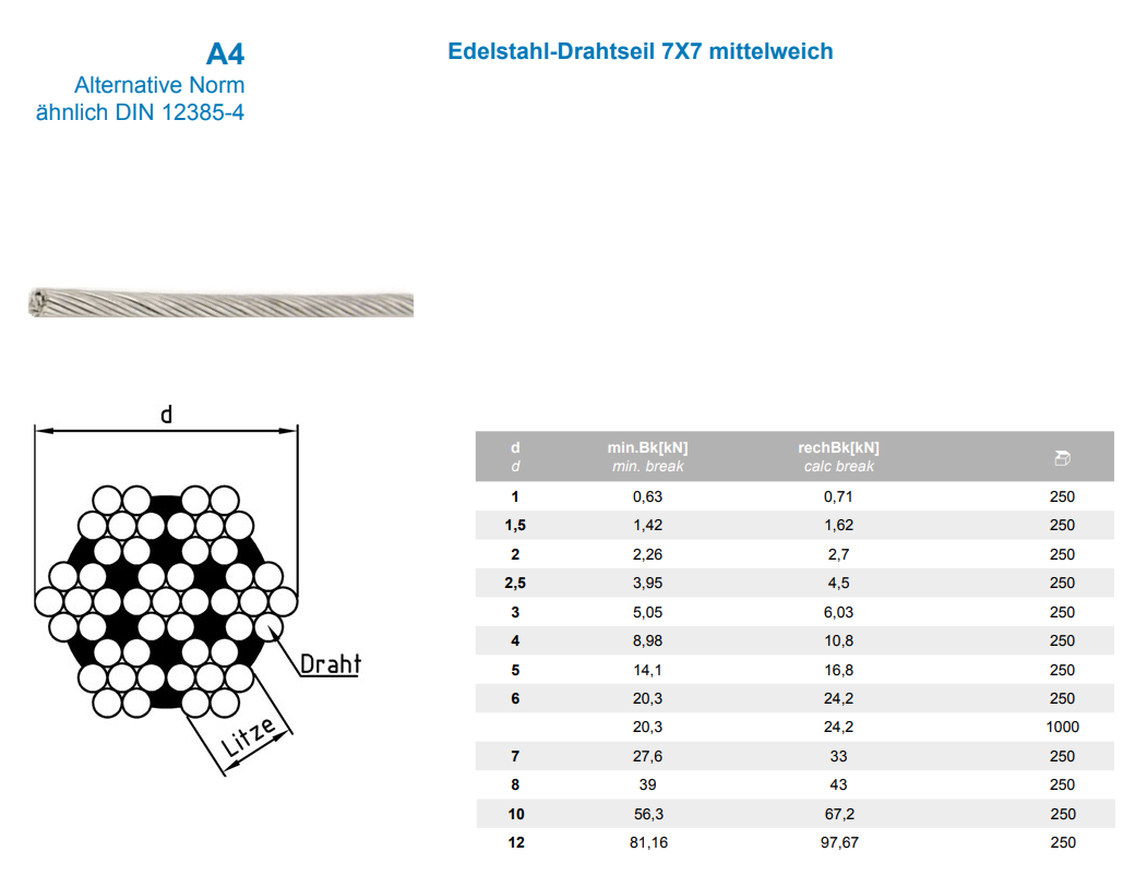 Edelstahl-Drahtseil 7x7 mittelweich, A4 rostfrei 10,0