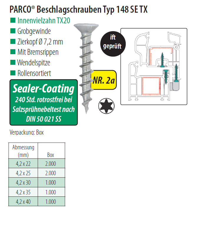 PARCO® Beschlagschrauben Senk-/Zierkopf Torx, Typ 148 SE TX Stahl Sealer Coating 4,2x25