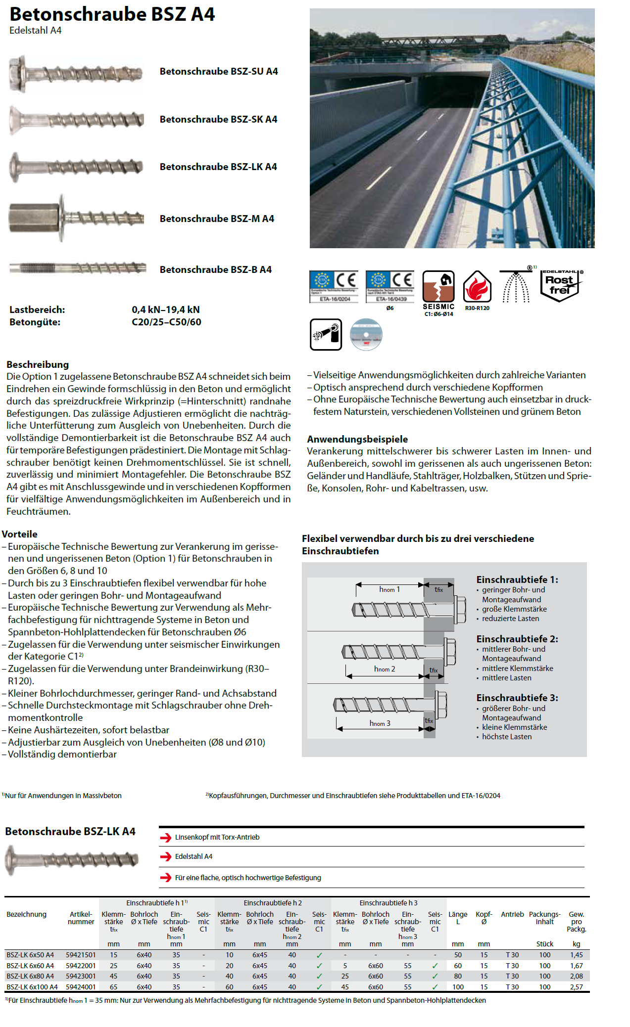 Betonschrauben Linsenkopf ø 15mm, BSZ-LK A4 rostfrei 6x50 K:10/15