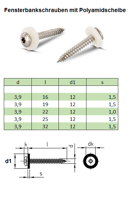 Fensterbankschrauben m. Polyamidscheibe, A2 rostfrei, braun 3,9x16