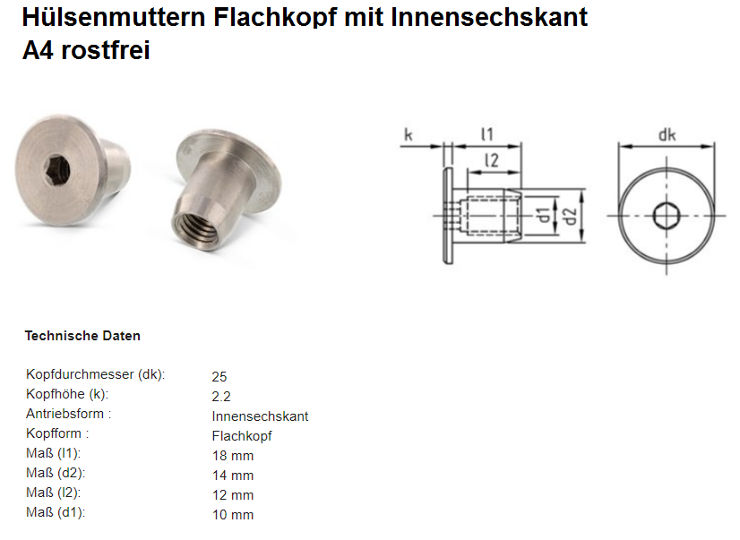 Hülsenmuttern Flachkopf mit Innensechskant, A4 rostfrei M10x18
