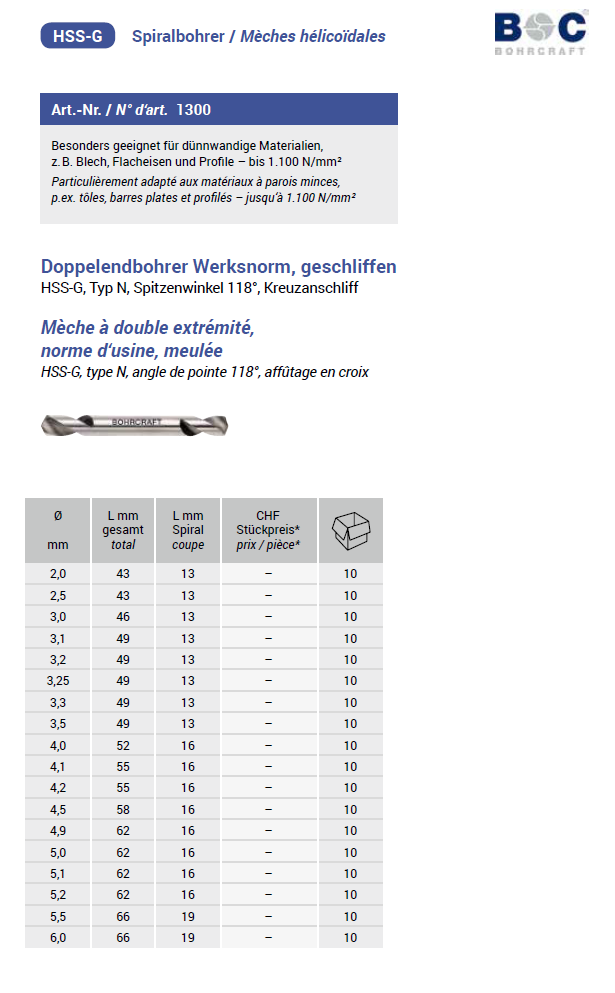 Bohrcraft Doppelendbohrer Werksnorm, geschliffen, Typ N HSS-G 5,5x66/19