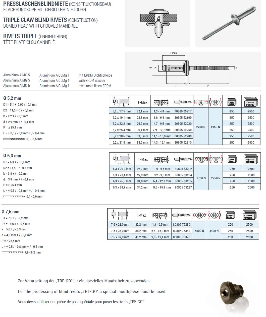 Presslaschen-Blindnieten Flachkopf TRE-GO mit EPDM, Aluminium-Aluminium 7,5x28 K:1-9,5