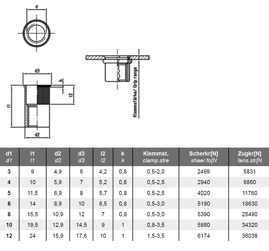 Blindnietmuttern kl. Senkkopf, gerändelt, P1021BB A4-1.4401 rostfrei M12x24 K:1,5-3,5