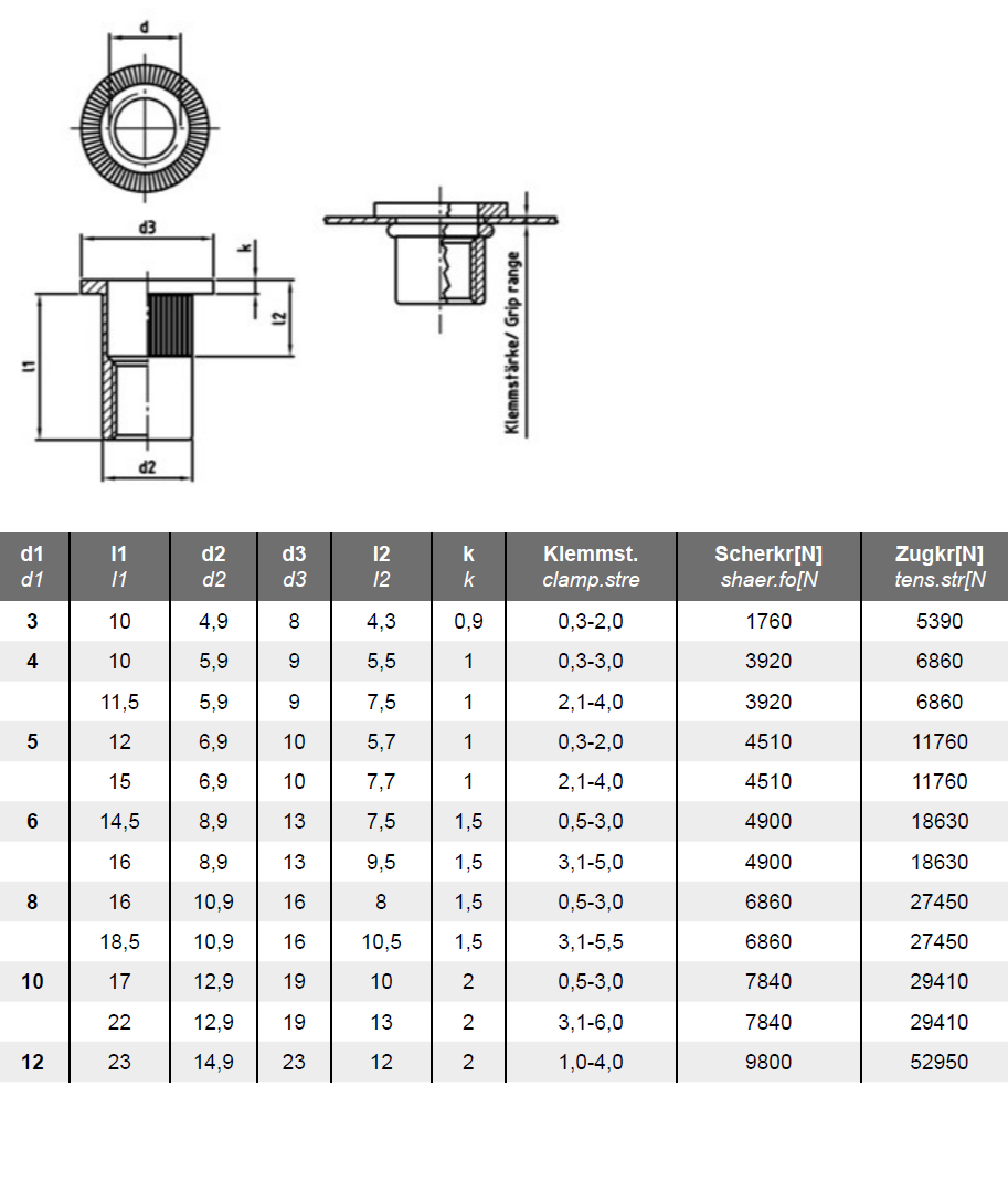 Blindnietmuttern Flachkopf, gerändelt, P1025BB A4-1.4401 rostfrei M8x16 K:0,5-3,0