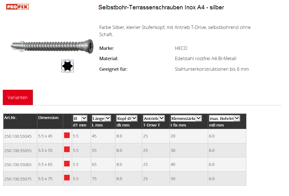Selbstbohr-Terrassenschrauben mit Antrieb T-Drive, A4 silber 5,5x55 K:30