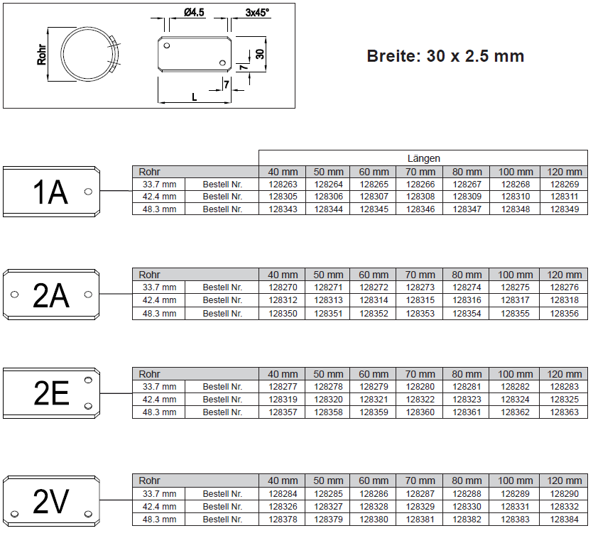 Auflagebleche für Handläufe Breite 30x2,5, Typ 1A Stahl S235JR 48,3x70
