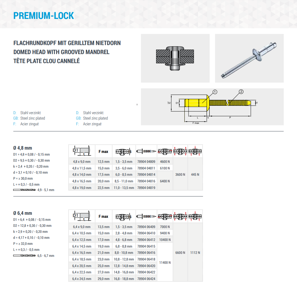 Blindnieten Flachkopf, hochfest, PREMIUM, Stahl verzinkt-Stahl verzinkt 4,8x16 K:8,5-11