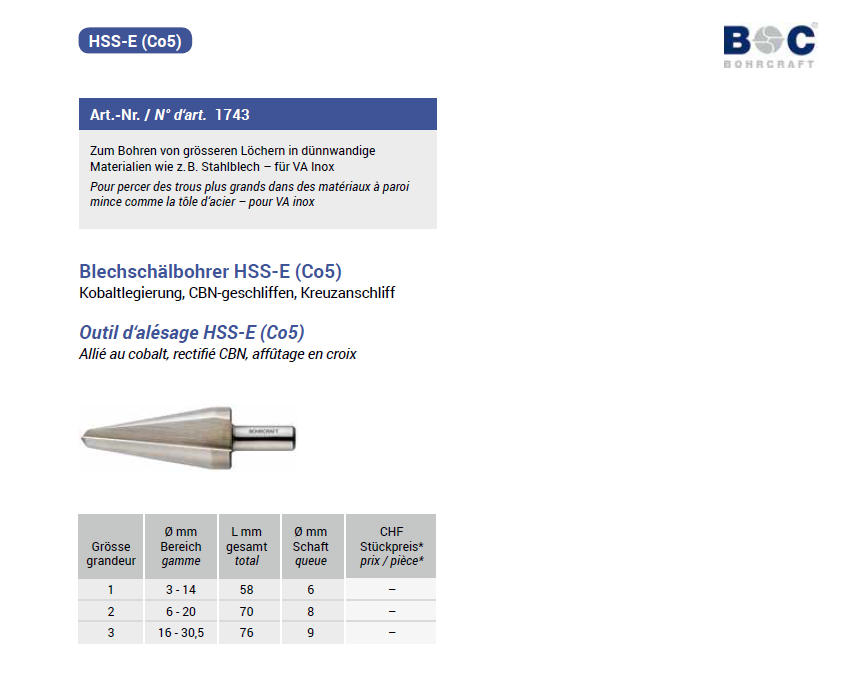 Bohrcraft Blechschälbohrer kobaltlegiert, HSS-E-Co5, CBN geschliffen Gr3/76 16-30,5