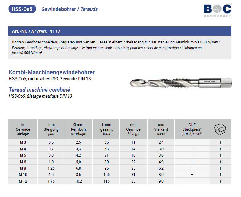 Bohrcraft Kombi-Maschinengewindebohrer, HSS-Co5 M6x80/22