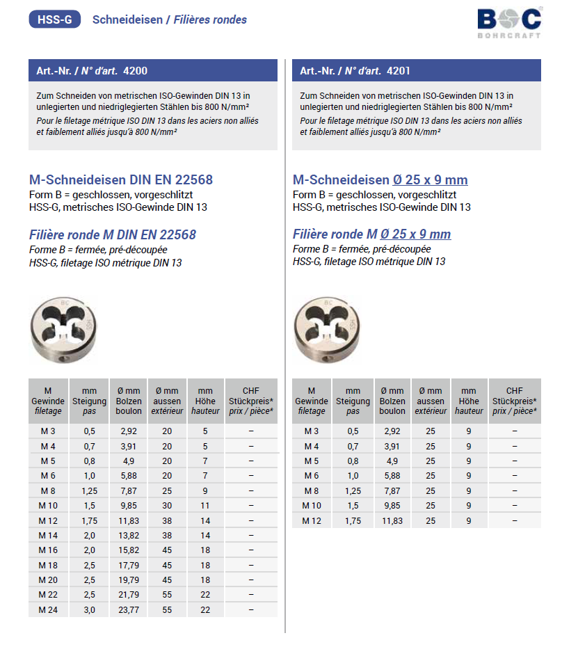 Bohrcraft M-Schneideisen, Form B HSS-G M8x1,25x9