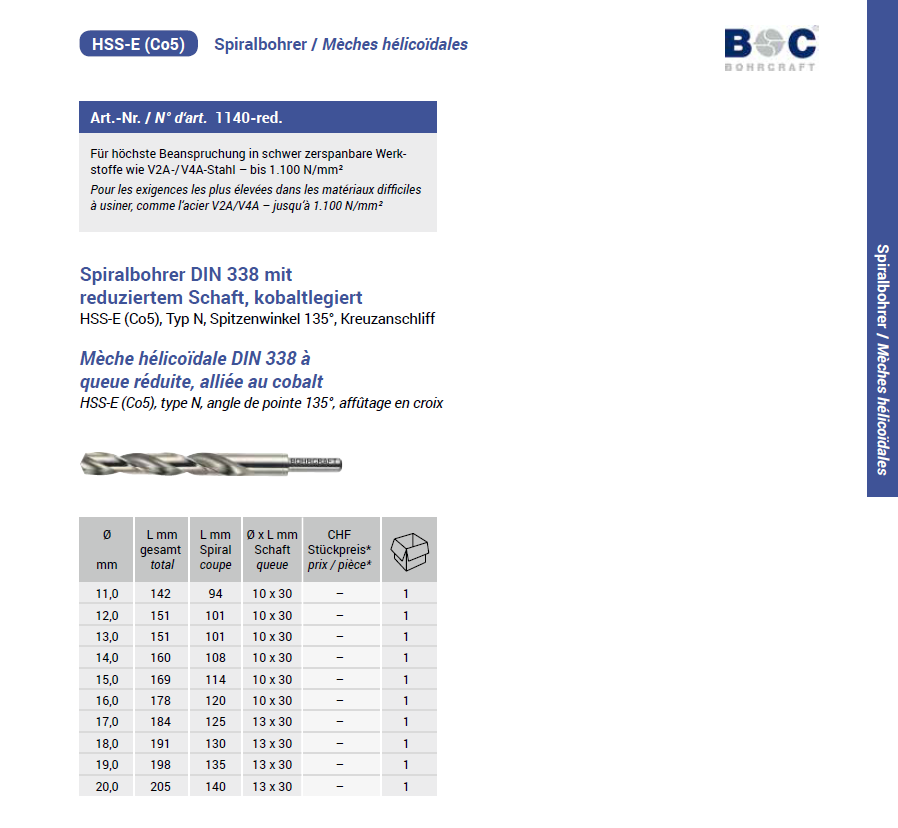 Bohrcraft Spiralbohrer red. Schaft, kobaltlegiert, DIN338/Typ N HSS-E Co5 13,0x151/101