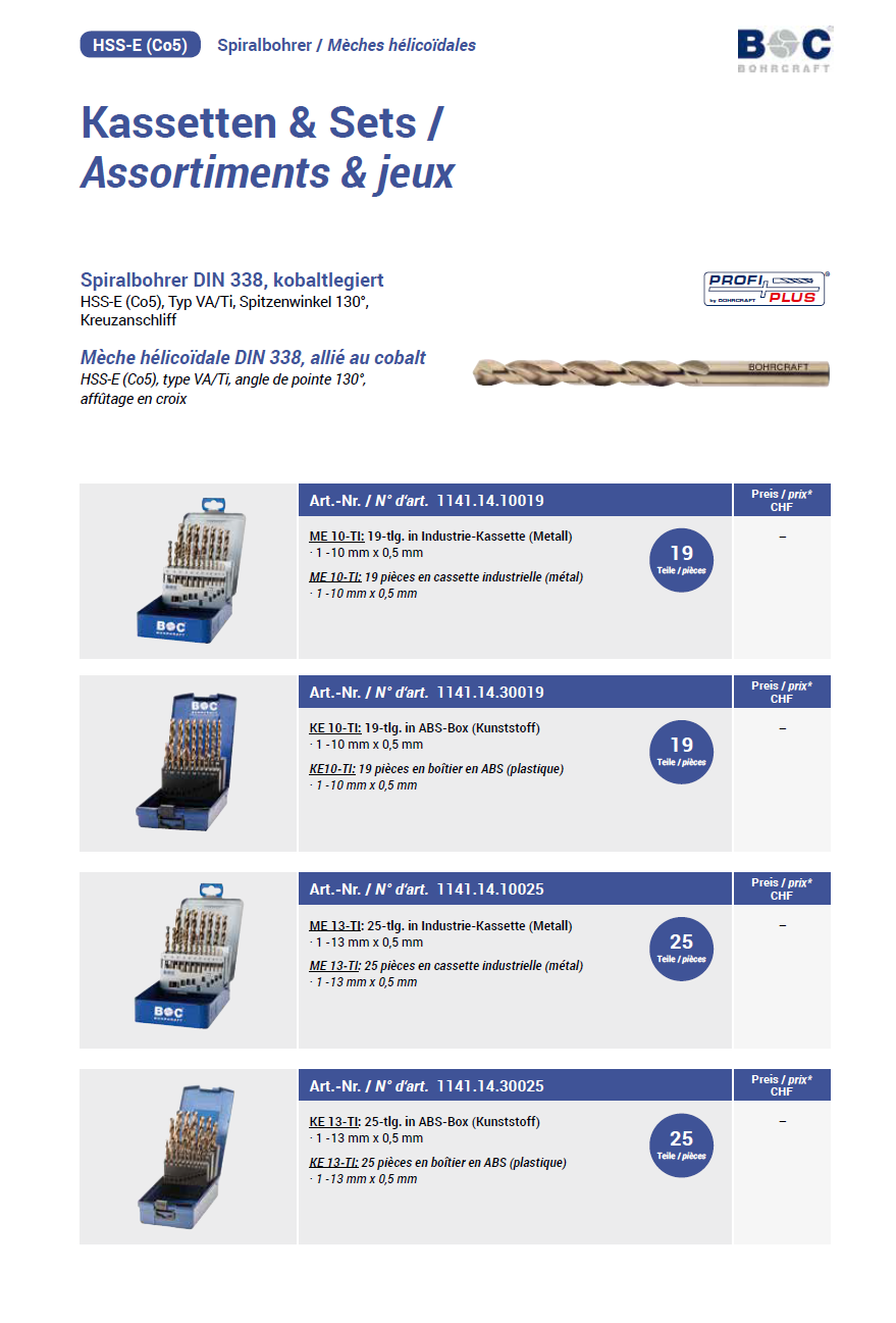Bohrcraft Spiralbohrer, kobaltlegiert SET 19-tlg., DIN338/Typ VA/Ti HSS-E Co5 1-10mm