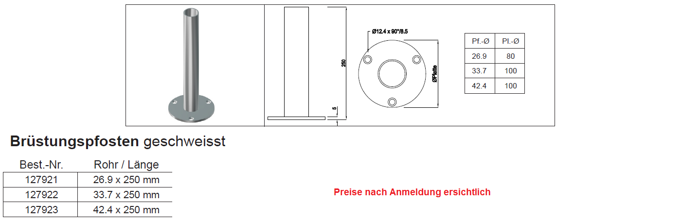 Brüstungspfosten für Rohrsattel, rostfrei geschweisst 33,7