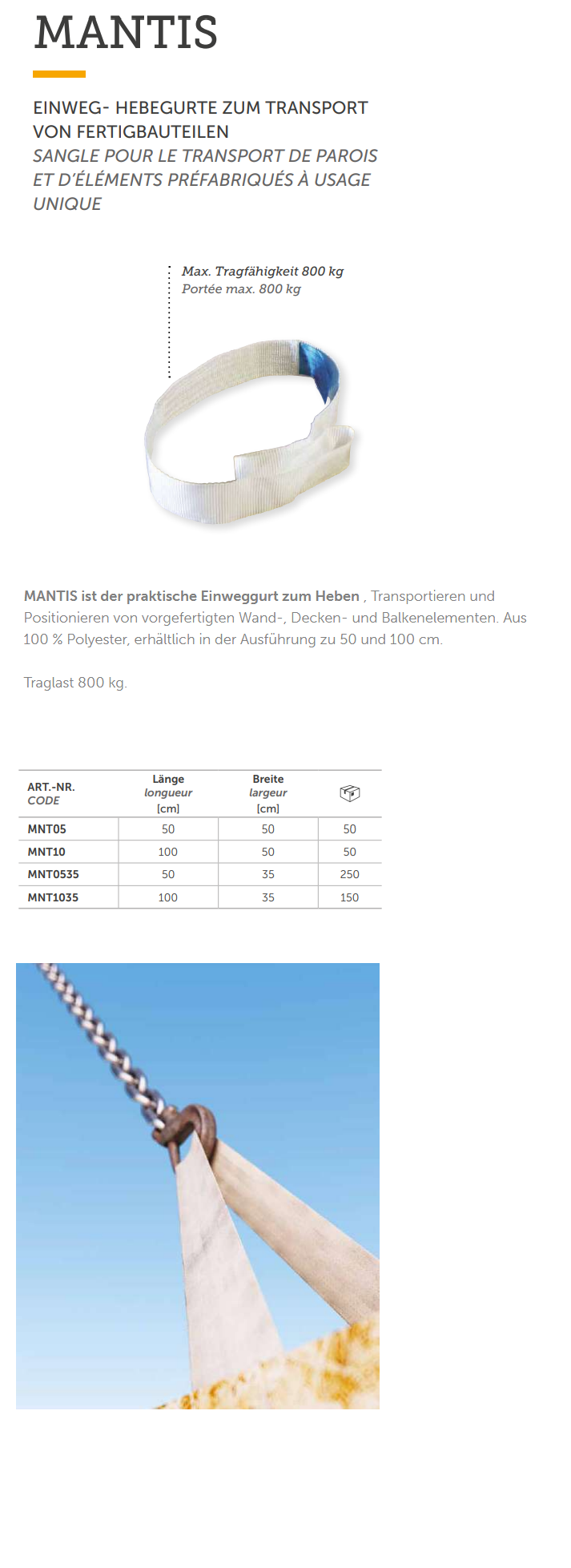 Einweg-Hebegurte zum Transport f. Fertigbauten, Typ MANTIS Polyester 1000x500