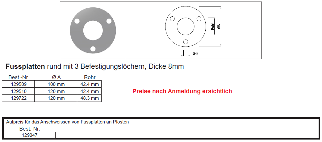 Fussplatte rund m. Zentrumloch u. 3 Bef.-Löcher, CNS geschliffen 100x8 ZL:42,4 BL:11