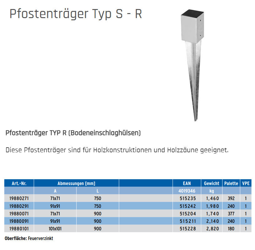 GH-Bodeneinschlaghülse Typ R Gruppe S, Typ R Stahl feuerverzinkt 91x91x900