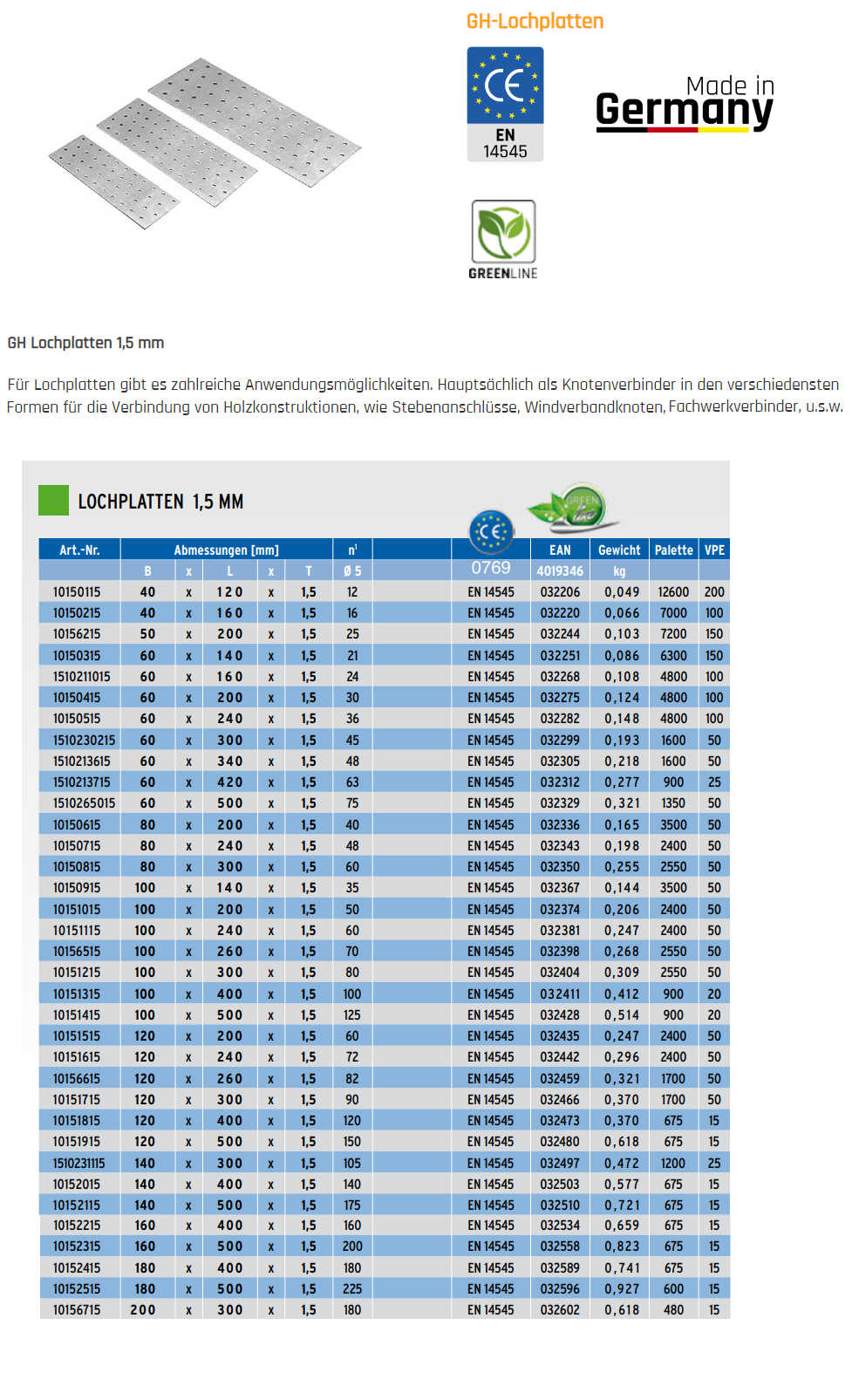 GH-Lochplatten 1,5mm, Stahl sendzimirverzinkt 180x500x1,5