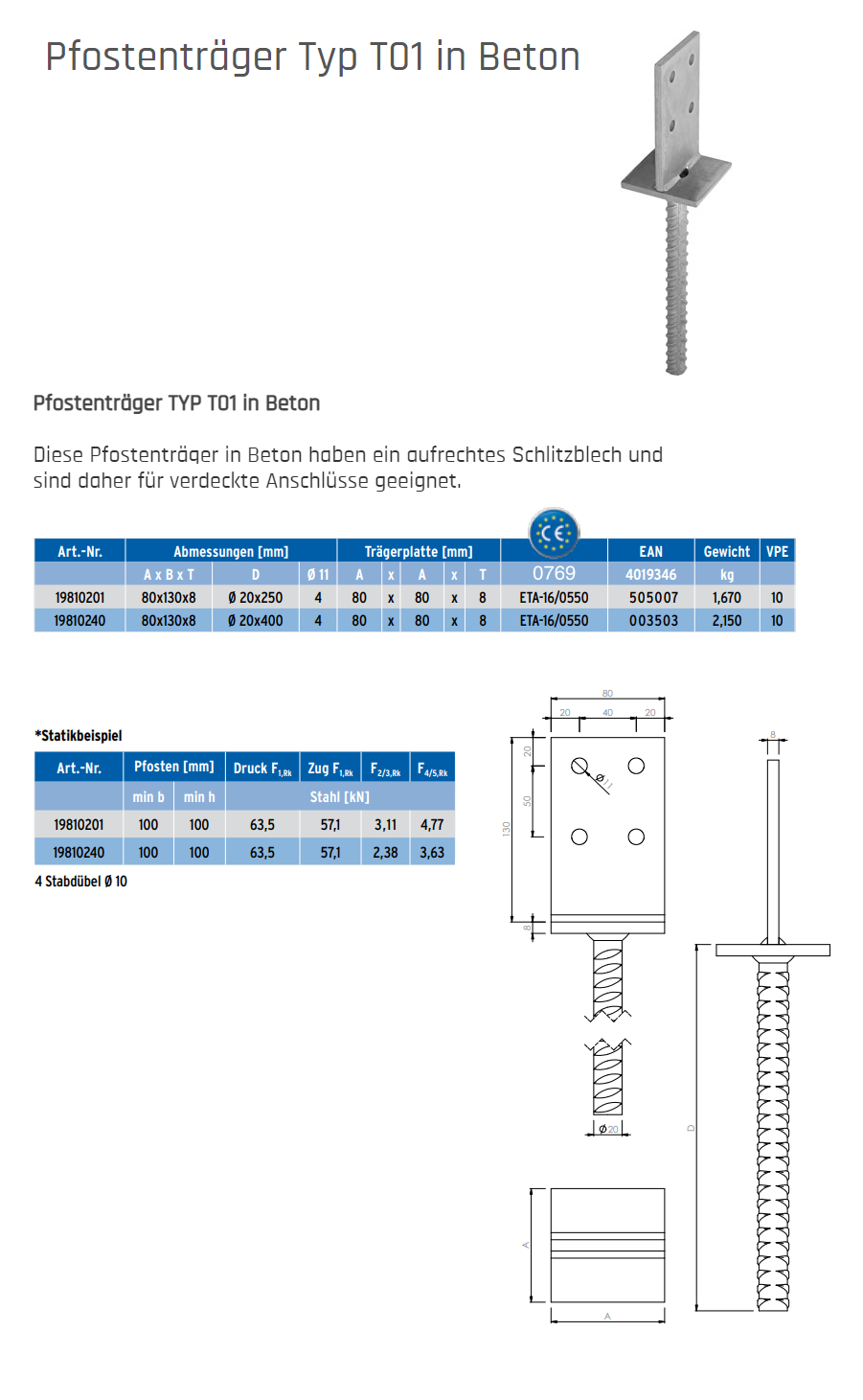 GH-Stützenfuss Typ T01 in Beton, Typ T01 80x130 Stahl feuerverzinkt ø20x400