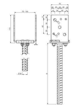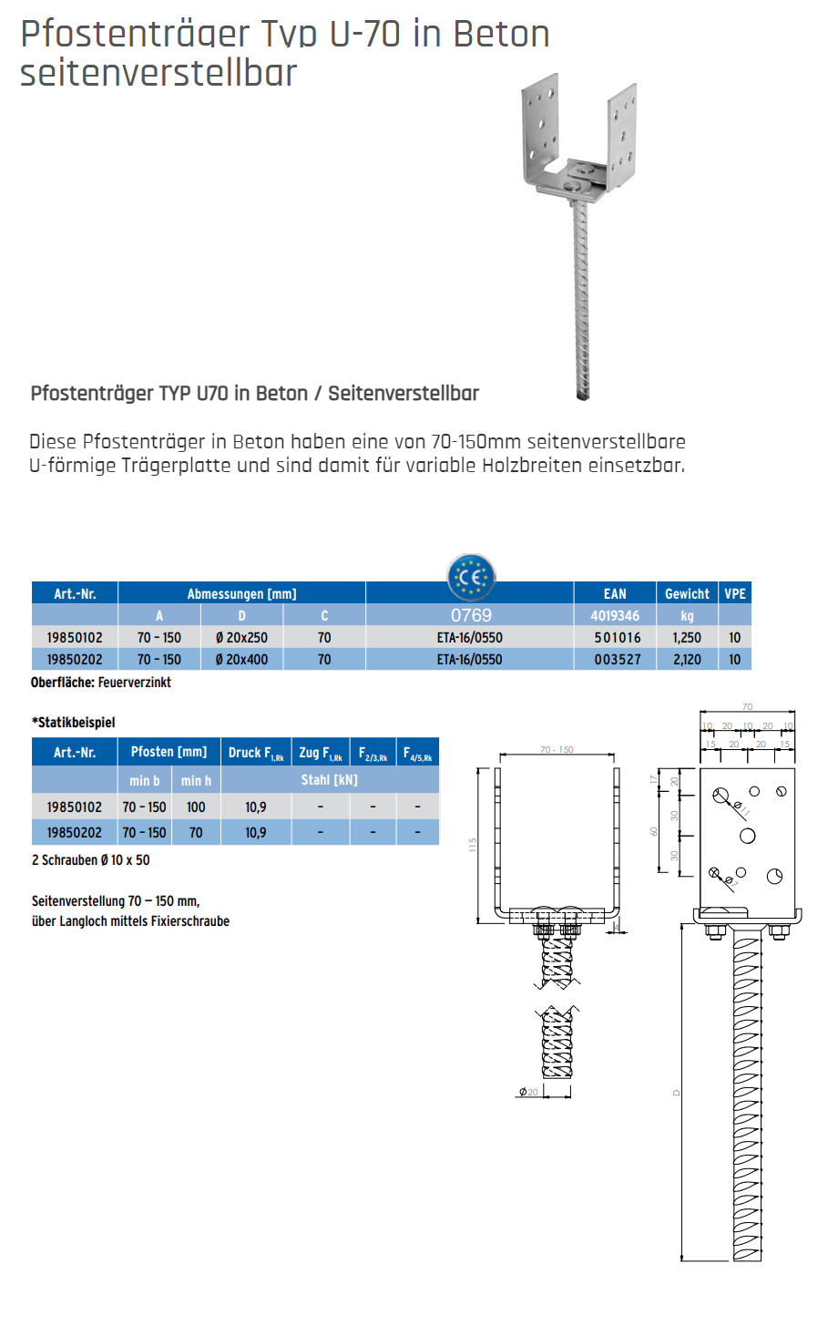 GH-Stützenfuss Typ U70 in Beton seitenverstellbar, Typ U-70 LW70-150 Stahl feuerverzinkt ø20x400