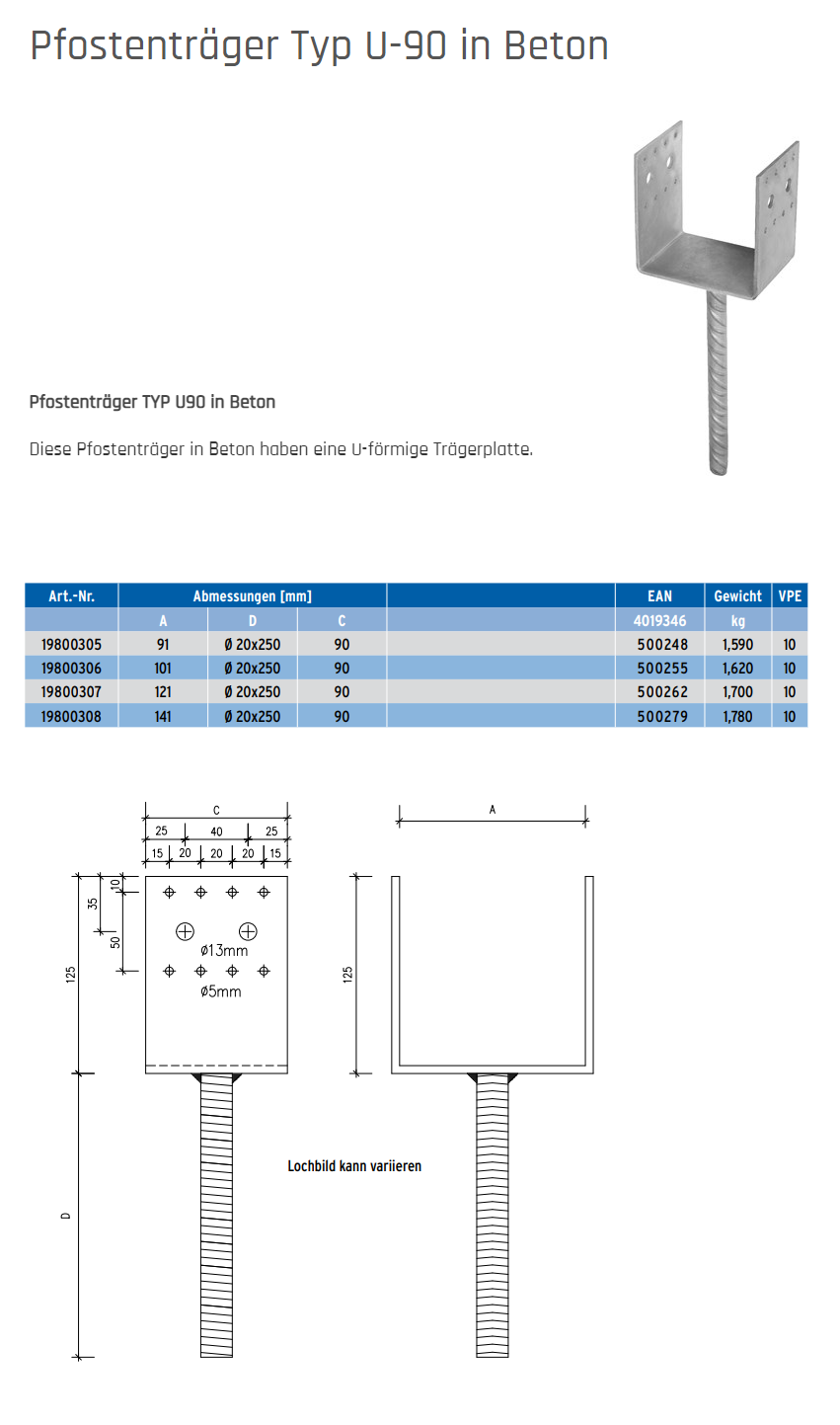 GH-Stützenfuss Typ U90 in Beton, Typ U-90 LW141 Stahl feuerverzinkt ø20x250