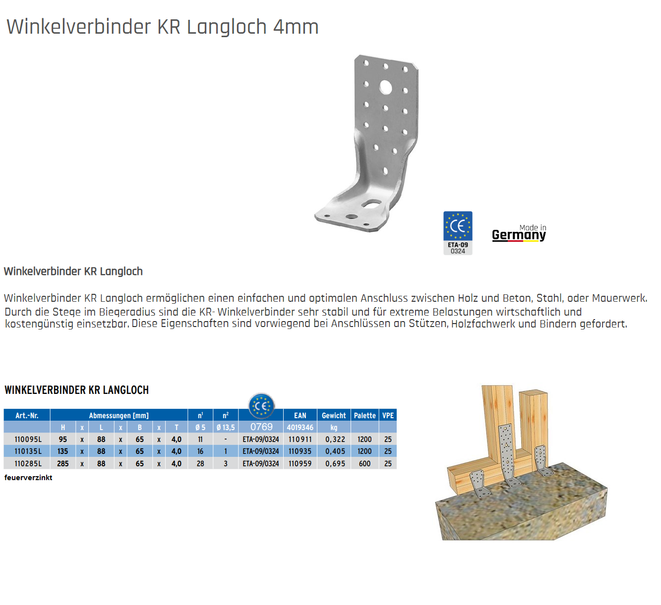 GH-Winkelverbinder Langloch, Typ KR Stahl feuerverzinkt 95x88x65