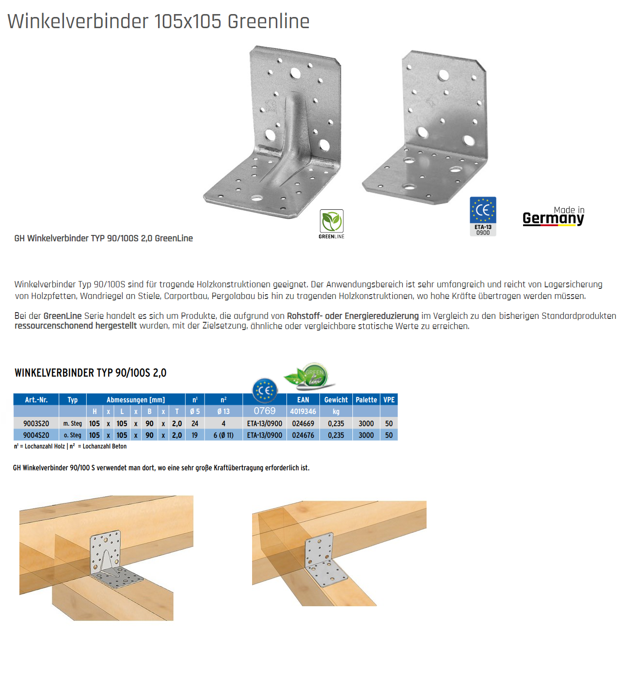 GH-Winkelverbinder m. Steg, Typ 100S 2,0 Greenline sendzimirver. 105x105x90