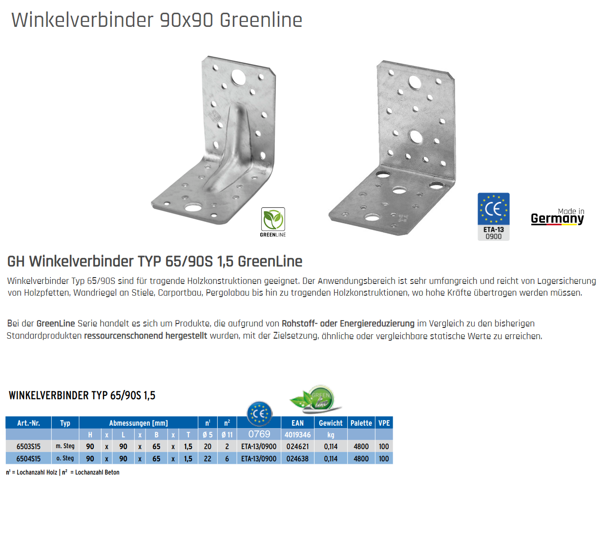 GH-Winkelverbinder o. Steg, Typ 65/90S 1,5 Greenline sendzimirverz. 90x90x65