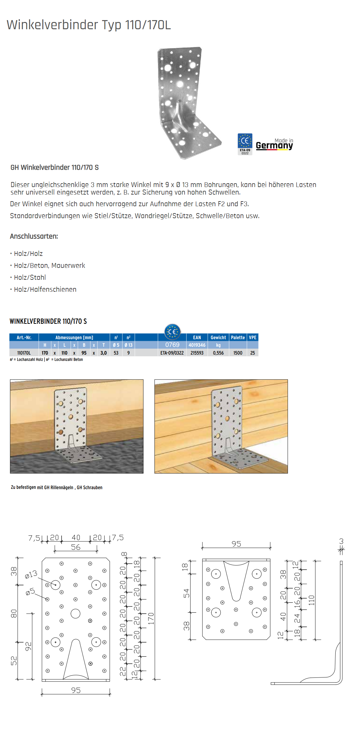 GH-Winkelverbinder, Typ 110/170L Stahl sendzimirverzinkt 170x110x95