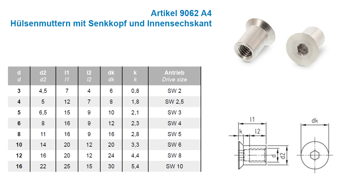 Hülsenmuttern Senkkopf mit Innensechskant, Art. 9062 A4 rostfrei M10x20