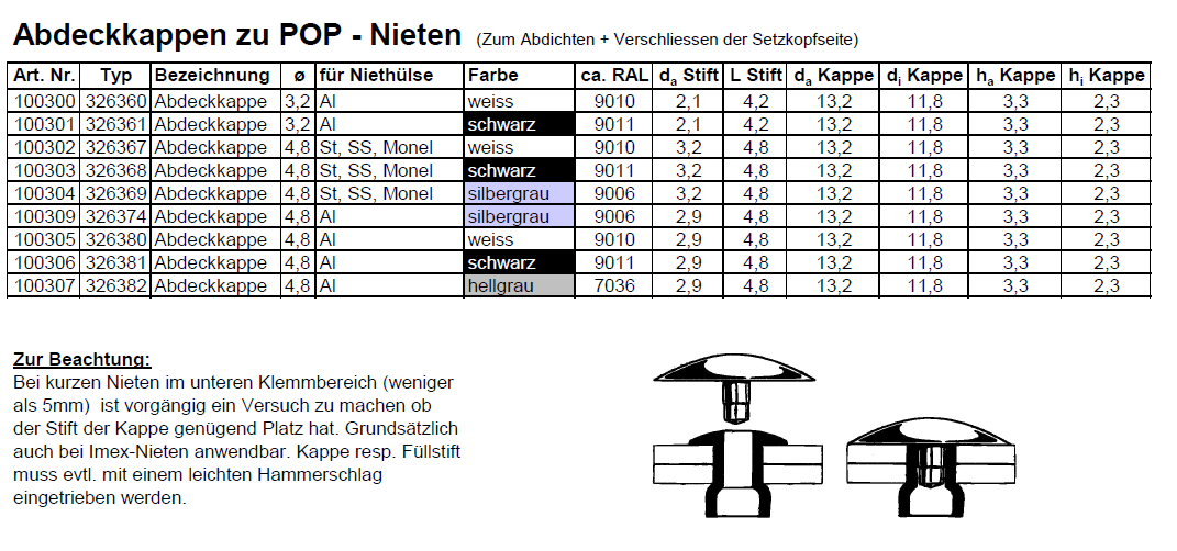 Abdeckkappen für Nieten AL ø3,2, PA weiss RAL 9010 2,1x4,2x13,2