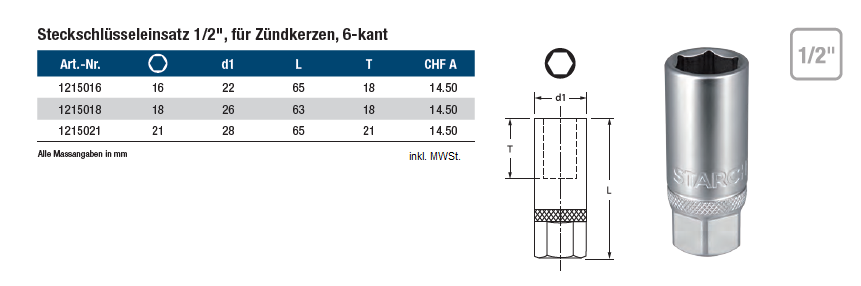Steckschlüsseleinsatz STARCH 6-kant 1/2", Chrom-Vanadium-Stahl matt satiniert 16x65 1/2"