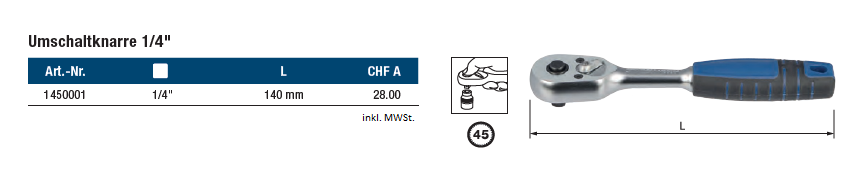 Umschaltknarre STARCH 1/4", Chrom-Vanadium-Stahl matt satiniert 140mm