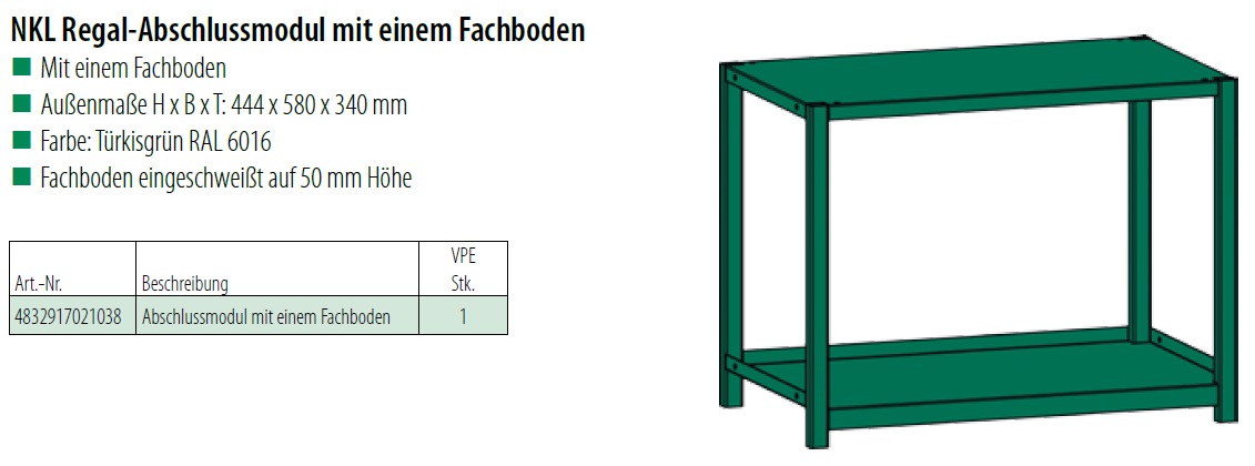 Küwi NKL Regal-Abschlussmodul mit 1 Fachboden, Stahl, RAL6016, türkisgrün 444x580x340