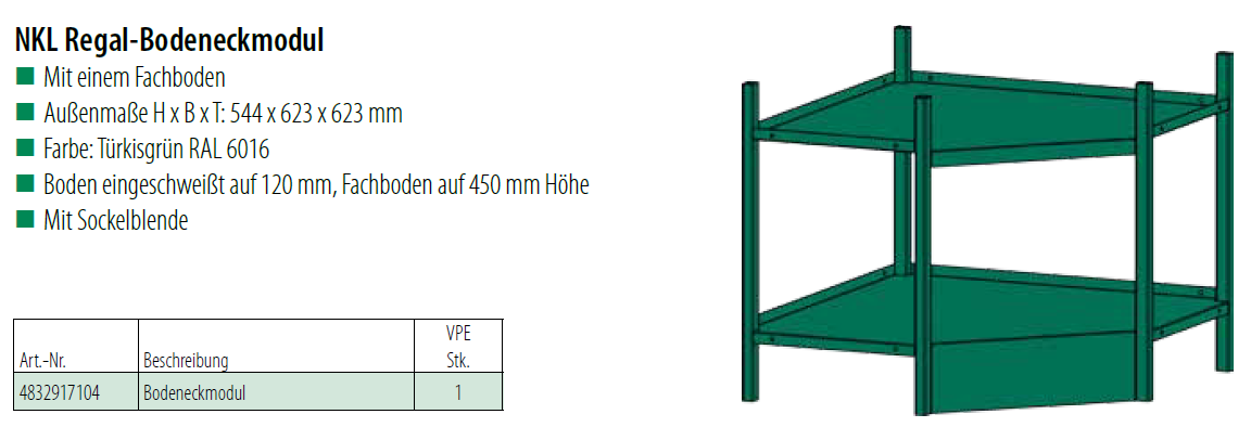 Küwi NKL Regal-Bodeneckmodul, Stahl, RAL6016, türkisgrün 544x623x623