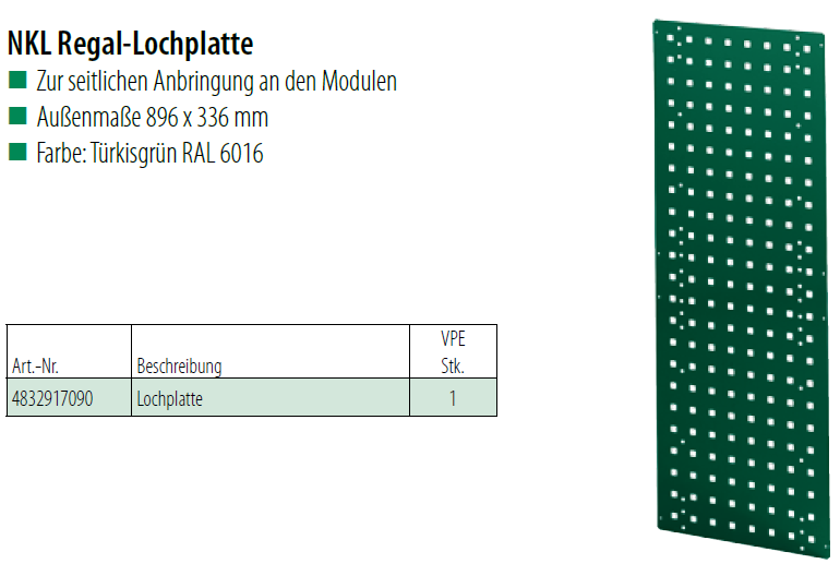 Küwi NKL Regal-Lochplatte, Stahl, RAL6016, türkisgrün 896x336