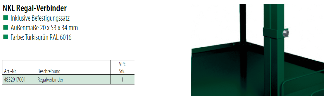 Küwi NKL Regal-Verbinder, Stahl, RAL6016, türkisgrün 20x53x34