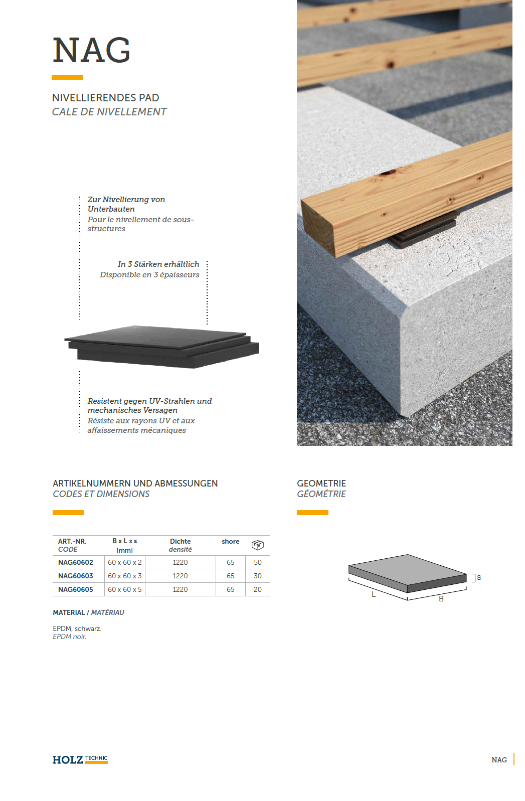 Nivelierendes Pad für den Terrassenbau, Typ NAG EPDM schwarz 60x60x3