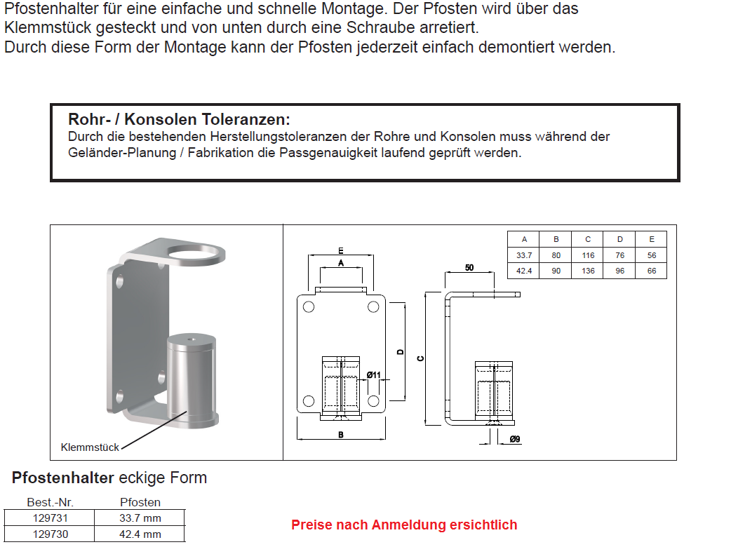 Pfostenhalter eckige Form, rostfrei geschliffen 33,7