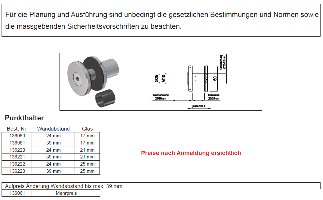 Punktglashalter 50mm, Wandabstand 39mm, 1.4301 M10-Glas 16