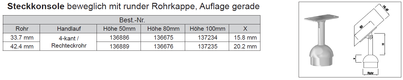 Steckkonsole bew. mit runder Rohrkappe f. 4kt.Rohr, 1.4301 33,7 H:80