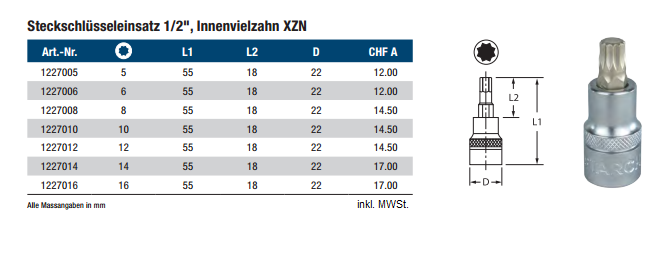 Steckschlüsseleinsatz STARCH 1/2" Innenvielzahn, XZN Chrom-Vanadium-Stahl matt satiniert 5x55 1/2"