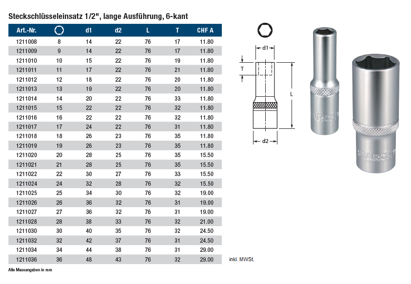Steckschlüsseleinsatz STARCH 6-kant 1/2" lang, Chrom-Vanadium-Stahl matt satiniert 36x76 1/2"
