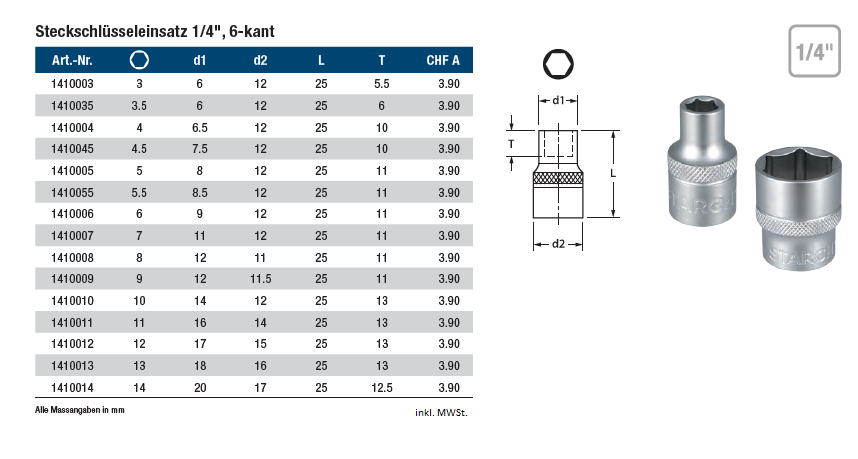Steckschlüsseleinsatz STARCH 6-kant 1/4", Chrom-Vanadium-Stahl matt satiniert 5,5x25 1/4"