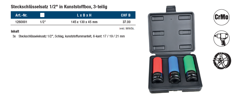 Steckschlüsselsatz STARCH 1/2" 3-teilig, in Kunstoffbox 147x130x45