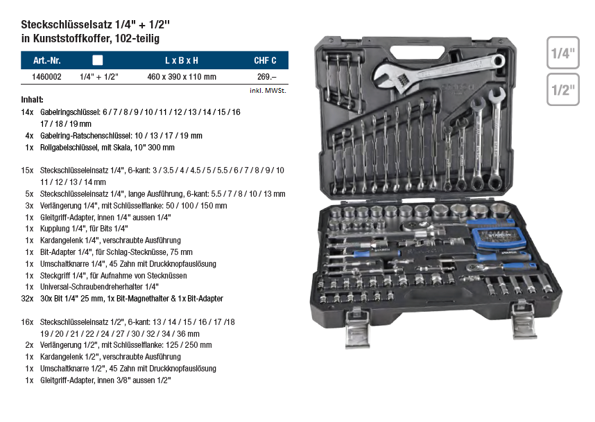 Steckschlüsselsatz STARCH 1/4" u. 1/2" 102-teilig, in Kunstoffkoffer 460x390x110