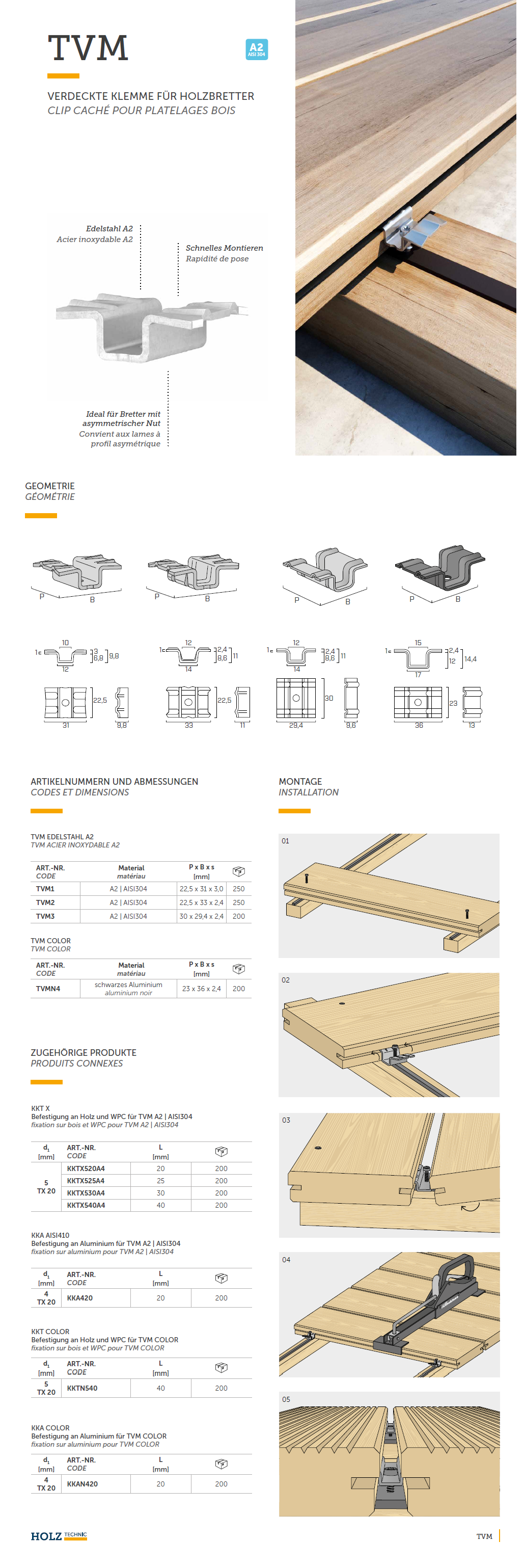 TVM verdeckte Klemme für Terassen-Holzbretter, Typ TVM1 A2 rostfrei 31x22,5x3,0